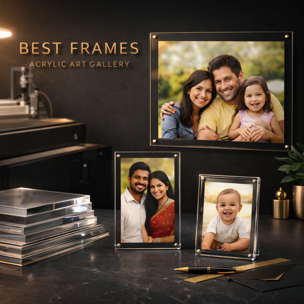 Best Frames – Acrylic Art Gallery started with a simple belief: every memory deserves a beautiful place on your wall. We wanted to create frames that are not just strong and stylish, but also premium in finish and clarity. From family moments and couple portraits to customised designs, our goal is to turn every photo into elegant acrylic wall art that enhances your home. Today, Best Frames offers a wide range of acrylic frames including Clear Acrylic, Studs Frames, Aluminium Frames, Backlight Frames, and Customisable designs. Every frame is made with attention to detail—polished edges, strong fittings, and crystal-clear acrylic—so your memories stay protected and look stunning for years.